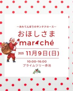 第一回おほしさまマルシェご参加頂きありがとうございました。2025.7.19日曜日無事開催できました◎はじめての会場で様々なご縁を頂き子どもたちの笑い声が響きとっても良い時間が流れていました!朝早くから出店頂きました皆様 […]